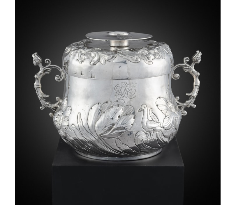 the bombé body boldly embossed and chased with three standing birds among large flowers, caryatid scroll handles, the reversible low domed cover chased to match with three smaller birds among flowers, flat reel-shaped finial, the body and cover engraved with a late 18th century script monogram DAD, fully marked on base and cover, the finial also with lion passant.