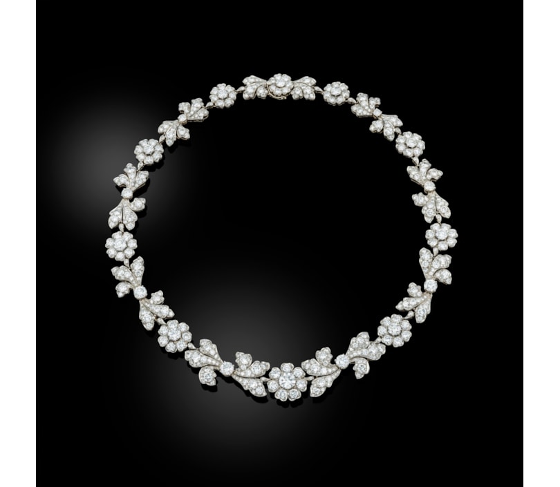comprising 10 flower head clusters set with a larger round brilliant cut diamond centre and smaller round brillint cut diamond petals, graduating from smallest at the clasp to bigger, each seperated buy double diamond set leaves joined by a central round brilliant cut diamond. of 1930s style, set in platinum. TCW approx 20-22.00 carats