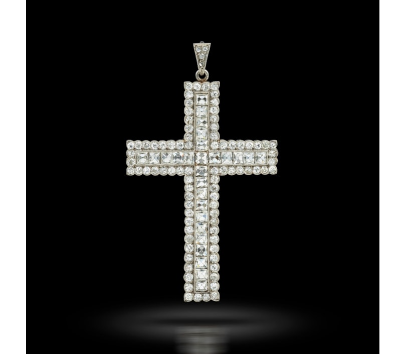 English c.1915, formed of square and old round cut diamonds, the body of the cross formed of all square cut diamonds, within a border of old round cut diamonds, millegrain set, giving a scalloped edge, all open set in platinum, hung from a diamond set bale.