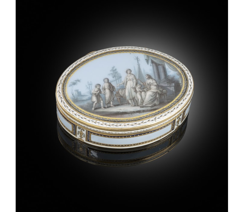 The box oval, the lid set with an enamel plaque representing Cornelia, mother of the Gracchi, and her children en grisaille in a classical landscape before curtain-hung pillars, in a gold and blue enamel border of alternating crescent and tulip-shaped paillons, the outer white enamel frame decorated with trailing foliage, the sides and base with pale blue enamel reserves bordered with gold and cobalt blue enamel bands, the sides further decorated with taille d'épargne enamel swag-hung urns on an opaque white enamel ground as dividers.