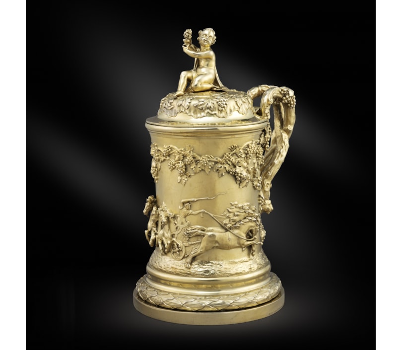 The tankard raised on a raised pedestal round base supporting a band of laurel. The main stippled matted body with a cast bifurcated vine branch handle terminating in a fruiting grapevine all cast and applied. Cast in high relief a chariot race with further grapevine spreading from the forked branch handle to frame the race. The cover chased with fruiting grapevine with an infant Bacchus finial clutching a cup and grapes.