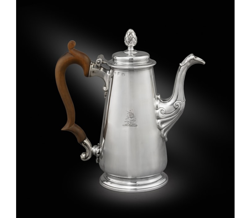 Paul de Lamerie arrived in England with his Huguenot parents in or before 1689, having been baptized at 's Hertogenbosch in the Netherlands in 1688. In 1703 he was apprenticed to the Huguenot goldsmith Pierre Platel, and after being admitted to the freedom of the Goldsmiths' Company, he registered his first mark and set up a workshop in Windmill Street, Soho, in 1712. He took thirteen apprentices between 1715 and 1749 who paid premiums varying between £10 and £45m In 1716 he married Louisa Juliott, also a Huguenot, and by her had six children, three of whom died in childhood. Little more of his personal history is known, although his career in the Goldsmiths' Company is comparatively well documented. By 1717, he was already referred to as 'the King's Silversmith' but again in a complaint 'for making and selling Great quantities of Large Plate which he doth not bring to Goldsmith's Hall to be mark't according to Law.' He joined the livery in 1717; fourteen years later he was elected to the court of assistants. In 1743 he was appointed fourth warden and in 1747 second warden; that he never became prime warden probably due to ill health. From the outset he had wealthy clients such as the Honourable George Treby and the Duke of Sutherland. Among his more important later patrons were Sir Robert Walpole, Baron Anson, and the fifth Earl of Mountrath. A gradual expansion of his business culminated in his move in 1739 to considerably larger premises in Gerrard street. His pre-eminent position in the trade is signified by the commission he received in 1740 from the Goldsmiths' Company to provide two of their most splendid pieces of ceremonial display plate, a silver-gilt inkstand and the famous rococo ewer and dish.