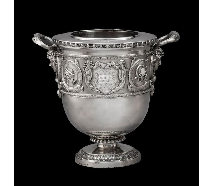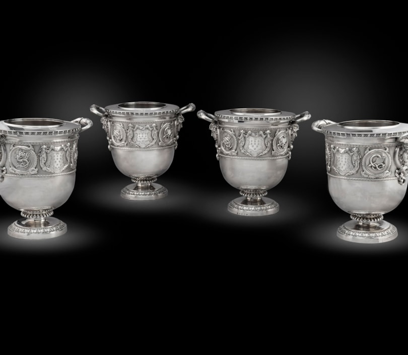 The partnership of Digby Scott and Benjamin Smith produced some of the greatest silver works of the early 19th century. Scott and Smith jointly ran workshops located in Greenwich, England from 1802 to 1807 and during their brief partnership were the principal suppliers of silver masterpieces to the esteemed firm of Rundell, Bridge & Rundell. At the time London's most prestigious firm, these jewellers and silversmiths supplied the official plate ordered by the Lord Chamberlain's office, and were the official "Jeweller, Gold and Silversmiths to the Crown" from 1798 to 1843. Working in the cusp of the late Georgian and early Regency periods, the works of Scott and Smith often feature elements of the classical revival style such as grapevines and rams' heads, all crafted in exquisite, sumptuous detail. One of their most renowned collaborative efforts, the Duke of York Baskets, created for Frederick Augustus (1763-1827), second son of George III, is currently on display at the Powerhouse Museum in Australia.