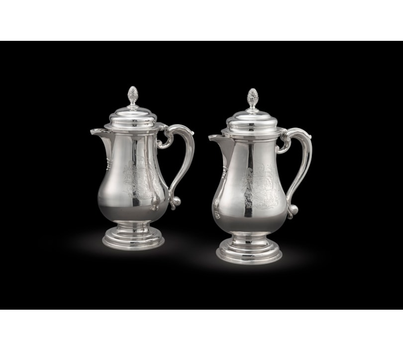 Baluster form, with leaf-clad scroll handle and spout with moulded drop, a hinged cover with bud finial, the sides engraved with a coat-of-arms, crest and motto within a rococo cartouche.
