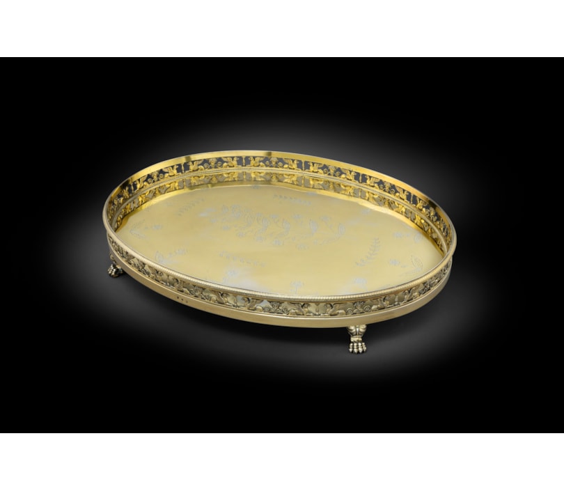 Raised on foliate chased paw supports below the openwork rim of griffins flanking urns interrupted by Mercury masks, classical leaf borders, the base later engraved with flowers in Russian taste, the base also with 1809-19 Paris control marks and Russian control marks.
