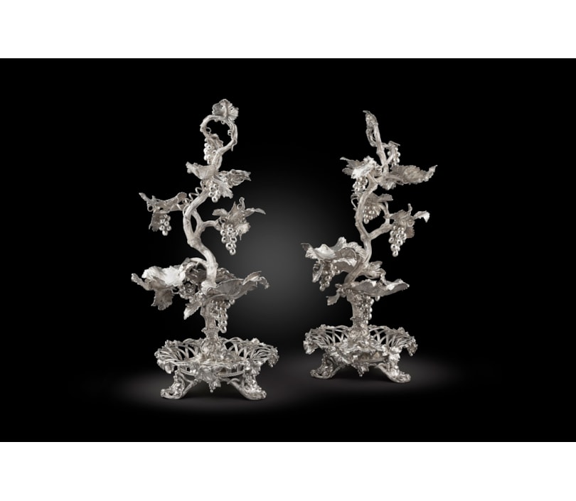 The centrepieces resting on vine branch feet adorned with grapes and vine leaves. These in turn support a trompe d’oeil of a wicker woven basket. From the basket grows the vine which rises to a looped handle again formed as a vine. The fruiting vine with dishes formed as the vine leaves.