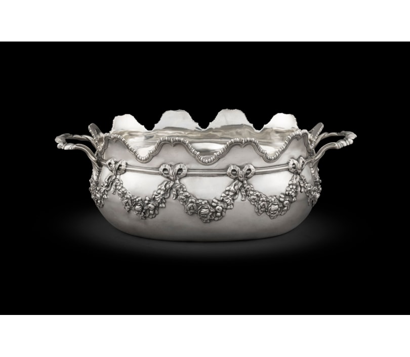 Garrard cast in relief with a continuous band of floral garlands and ribbon bows beneath a gadrooned rim, flanked by scroll handles.
