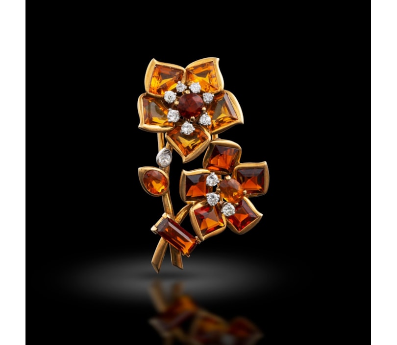 Two-tone citrine and diamond double headed flower spray brooch by Cartier, London c.1950, with petals formed of square and pentagonal cut citrines, the central citrines in each flower each surrounded by round cut diamonds, all open bezel set in gold, signed 'Cartier London', stamped 750 with makers mark for Jacques Cartier, serial no: 4628