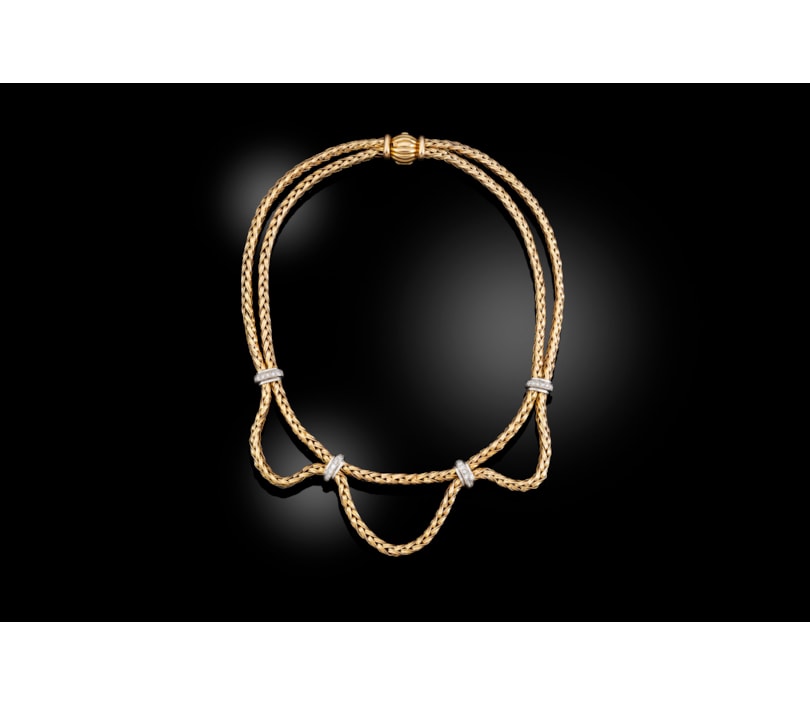 The two rows composed of plaited gold chain, the lower swag secured by four diamond set connections, set in white gold, signed 'MAUBOUSSIN' to reverse of clasp with French gold marks and serial number 'X450'.