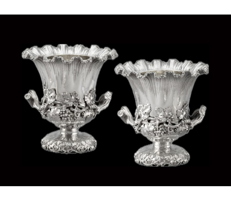 The wine coolers of fluted campana-form with furled rocaille rim. Each on a circular domed base, cast and chased with scrolls and rocaille decoration. The lower body applied and chased with scrolling grapevines terminating in crossed vine handles.