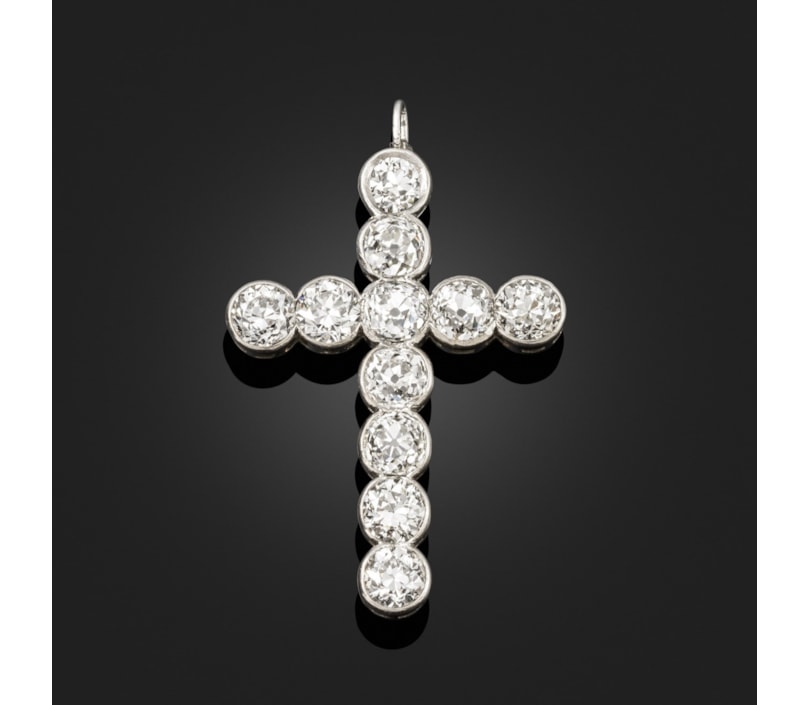 of Latin form, the arms formed of old brilliant cut diamonds, eleven in all, open collet set forming a scalloped edge, simple hinged pendant loop, mounted in platinum,
