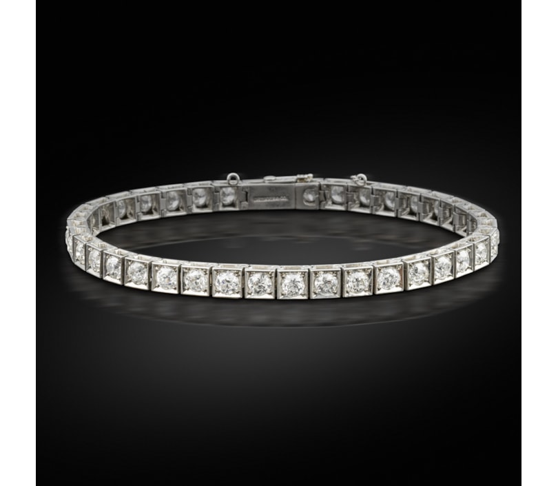 Art Deco diamond line bracelet by Dreicer, New York, box collet set with 39 old European brilliant cut diamonds, engraved scroll detail to the openwork gallery, open set in platinum and with gold fitting, signed 'DREICER & CO' approximately 6.45cts of diamonds total