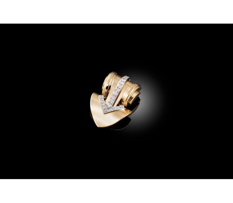 in the form of an arrow in 14k gold with a central tow of brilliant cut diamonds.