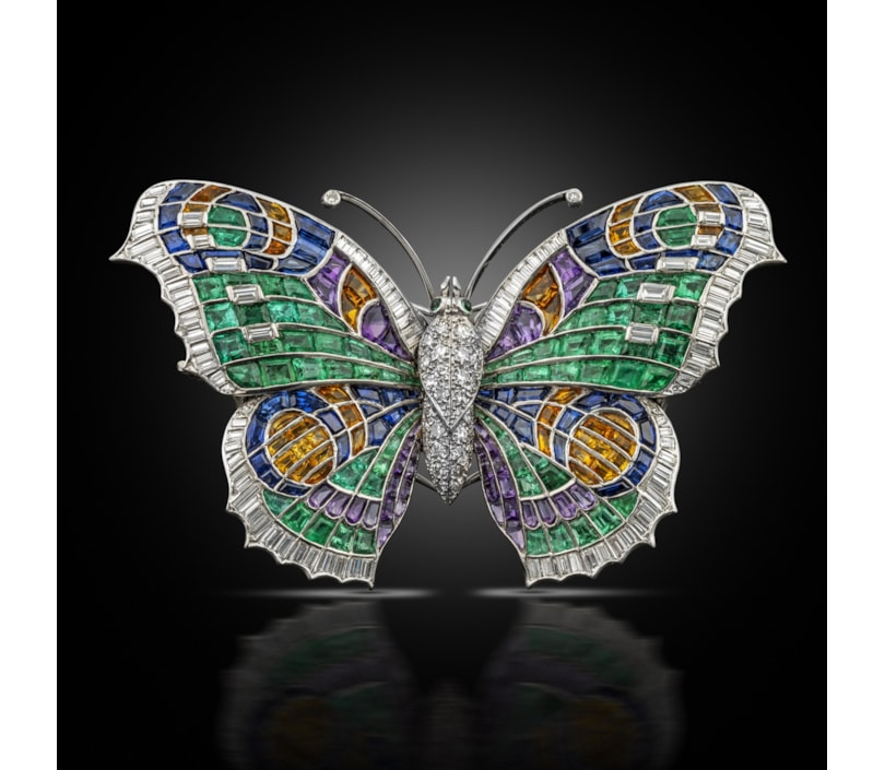 forming a pair of clips, the wings set with lines of calibre cut emeralds, picked out with calibre sapphire, Citrine and amethyst markings, baguette cut diamond line edges and accents, the body set with single cut diamonds, a cabochon emerald to each eye, knife-bar antennae with diamond accent terminals, channel and collet set in platinum and with white gold fittings, the butterfly separating down the middle for wear as single wing clips in manner of a butterfly with wings closed.