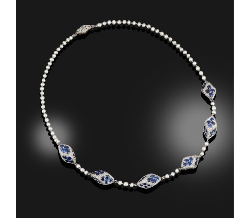 Early 20th century pearl chain necklace with sapphire and diamond set rhombic prisms, the six prisms are set with four round blue sapphires and small diamonds along the edge, interspersed by three pearl links, and twenty-six pearl link on each end finishing with a marquise shape diamond set clasp.