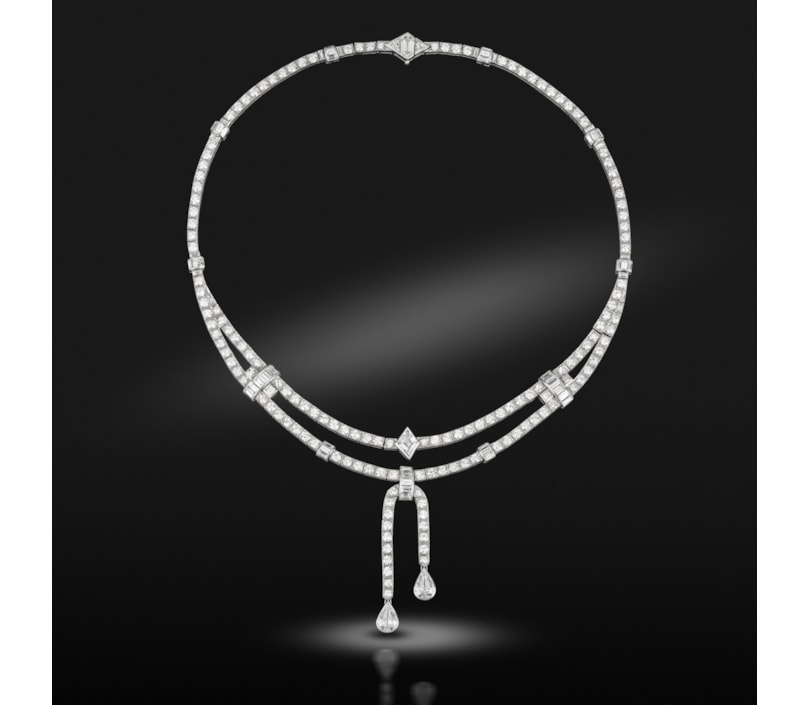 of delicate swag design set throughout with circular cut, baguette cut, and kite cut diamonds, suspending two old pear cut drops. The clasp set with a hexagonal cut and two triangular cut diamonds. Mounted in platinum.