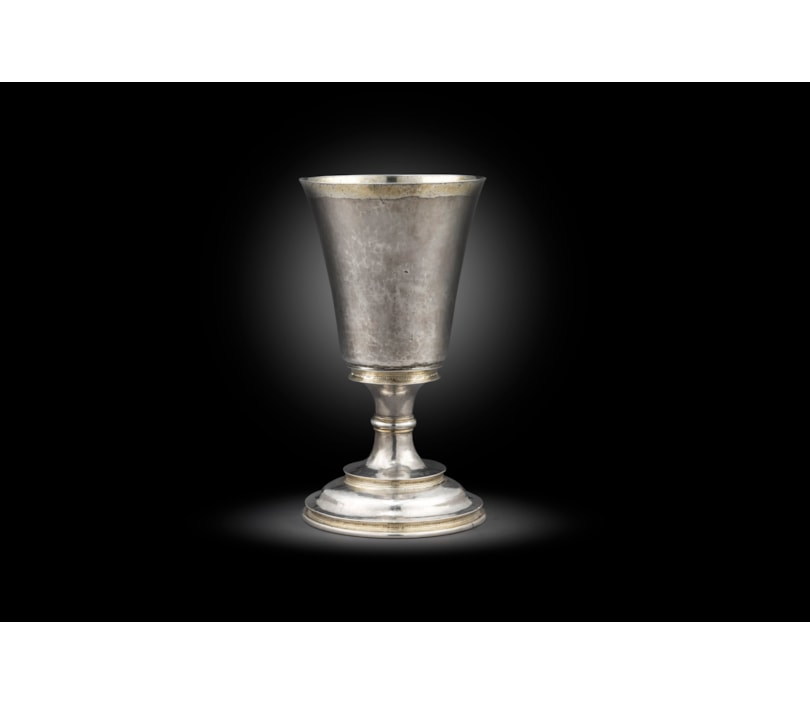 The cup is quite plain; it stands on a domed foot and has a tapering and slightly flared bowl and spool-shaped stem. The lip and inside of the bowl are gilded.