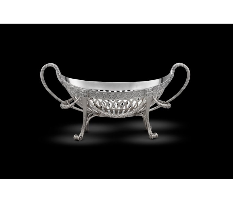 Navette-shaped, on four foliate scroll feet and with reeded loop handles, the basket pierced with ogival arches and applied with laurel garlands, the rim chased with Vitruvian scrolls on matted ground, engraved inside with a crest and motto, marked underneath, with workshop number 8172