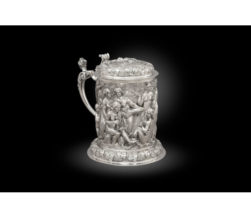 A magnificent English silver tankard crafted by the esteemed silversmith Robert Garrard in London. This exceptional piece features a detailed repousse design and is influence by the German 17th century baroque examples from Augsburg or Nurenberg showcasing a Grecian nude relief that wraps around the body of the tankard, epitomizing the neoclassical style that was popular in early 19th-century England.