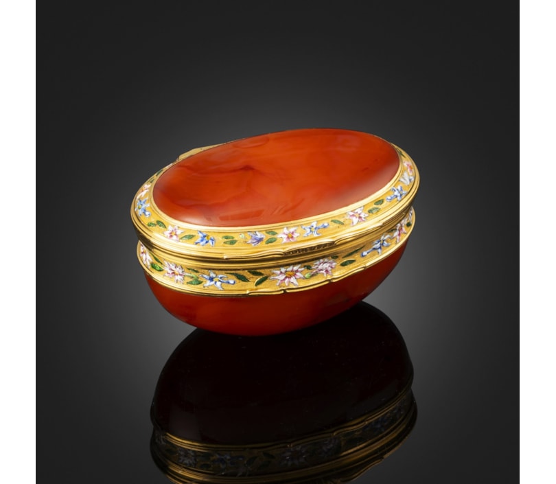with a carved carnelian body and panel to the lid the gold rims embellished with enamelled flowers and foliage in shades of pink, blue, white and green, fluted band to the edges.