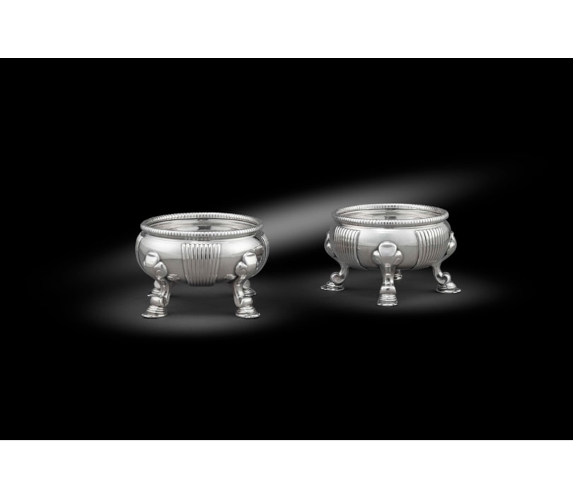 The salts with a bulged bowl; at the neck there is an inner band with outer moulding above, which is everted gadrooned flange with scalloped edge. Four shells are applied below the moulding and, and four scrolled legs with trefoil headings, set on circular feet.