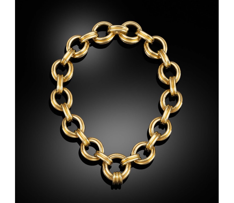 comprising 12 large smooth gold circular 2 stepped links with a larger link at the centre, joined by half links. Signed Cartier. 18k.