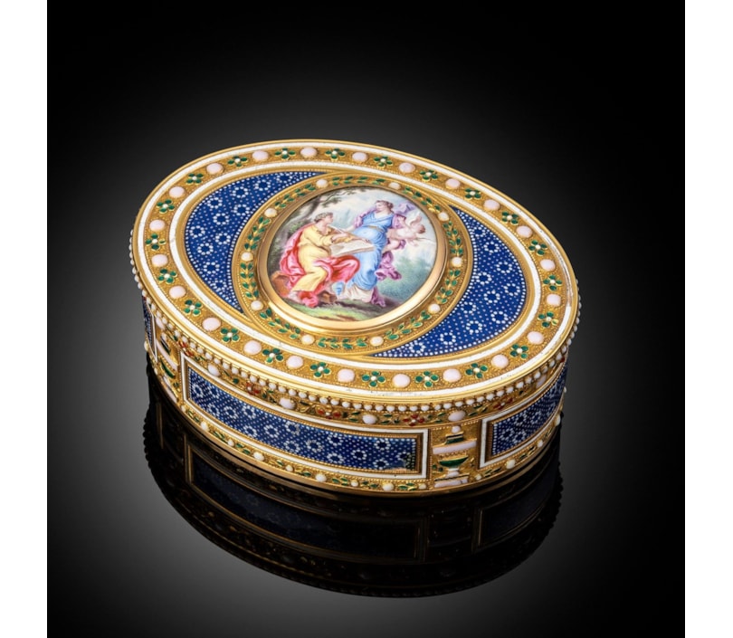The box of oval form, the lid set with a contemporary oval enamel plaque representing a writer and his muse, the reserves enamelled in translucent blue over engine-turning scattered with pellets highlighted with a border of opaque white dots, the sides and base similarly decorated.