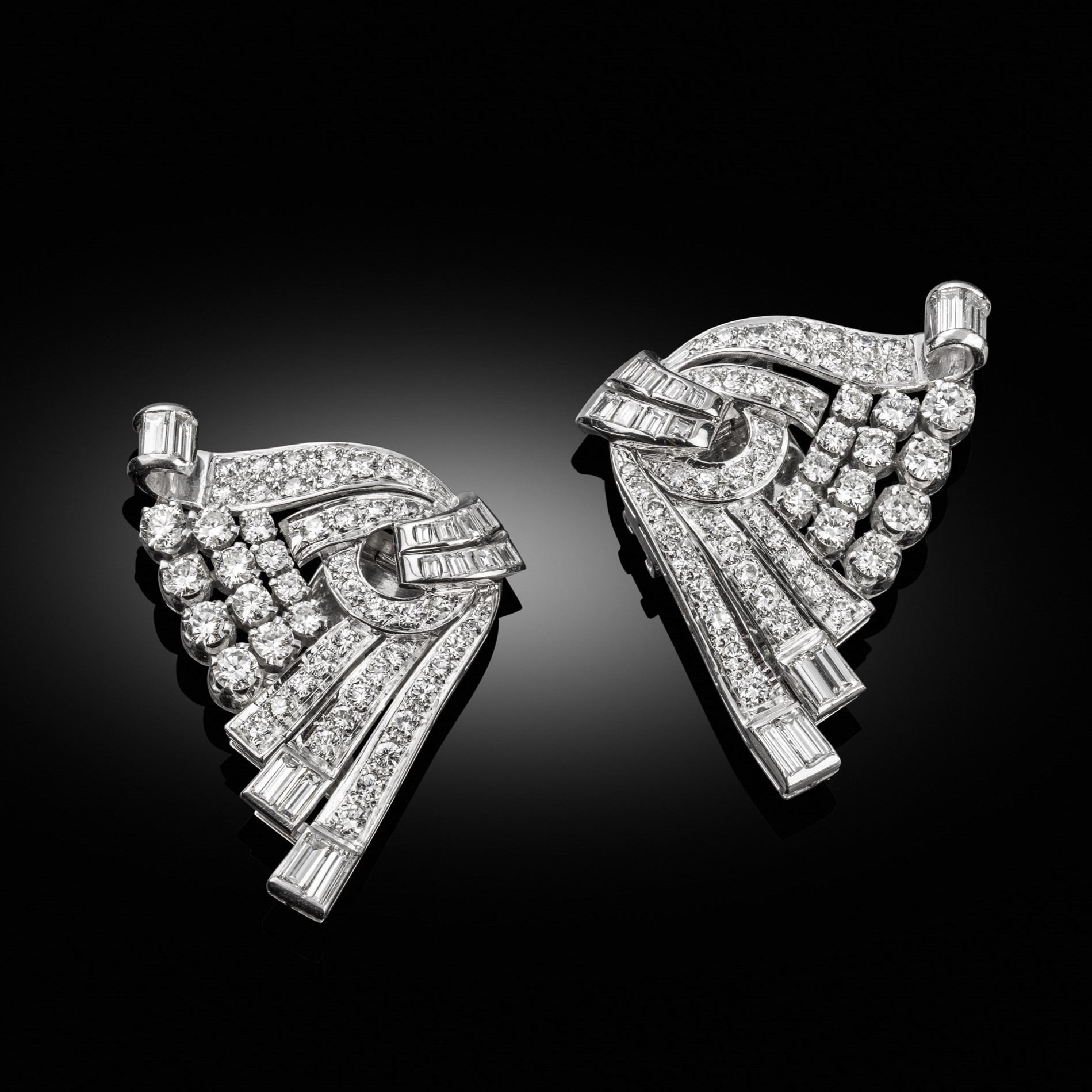of wing-like design set in platinum with channel and claw set baguette cut and round brilliant cut diamonds. With full brooch fitting.