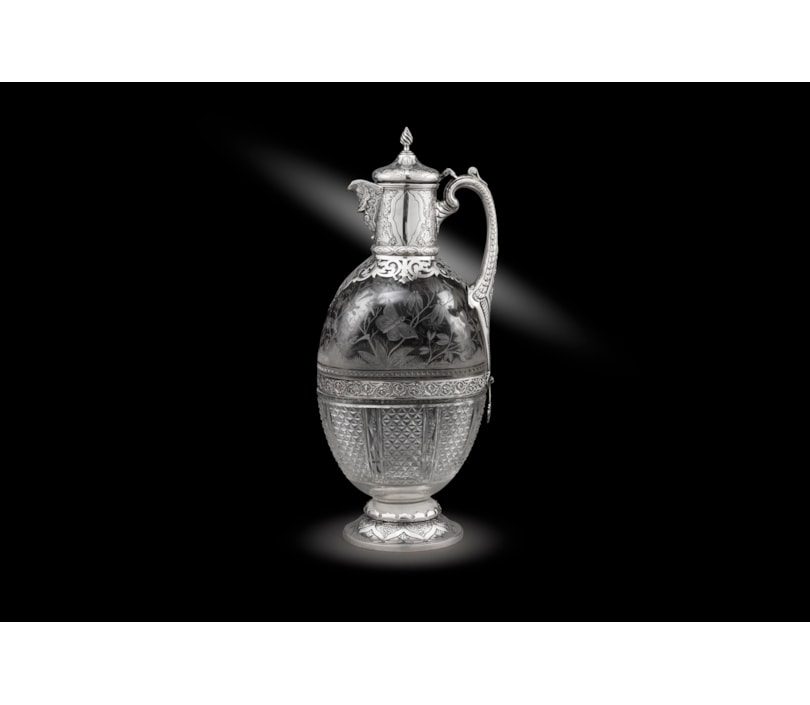 The claret jug resting on a round base chased with a petal design. The lower half of the jug cut with flutes and hob-nail design. The central pierced band formed as scrolling foliate décor. The top half of the jug etched and engraved with blossoming trees and a stork to one side and similar foliate trees and a butterfly to the other.