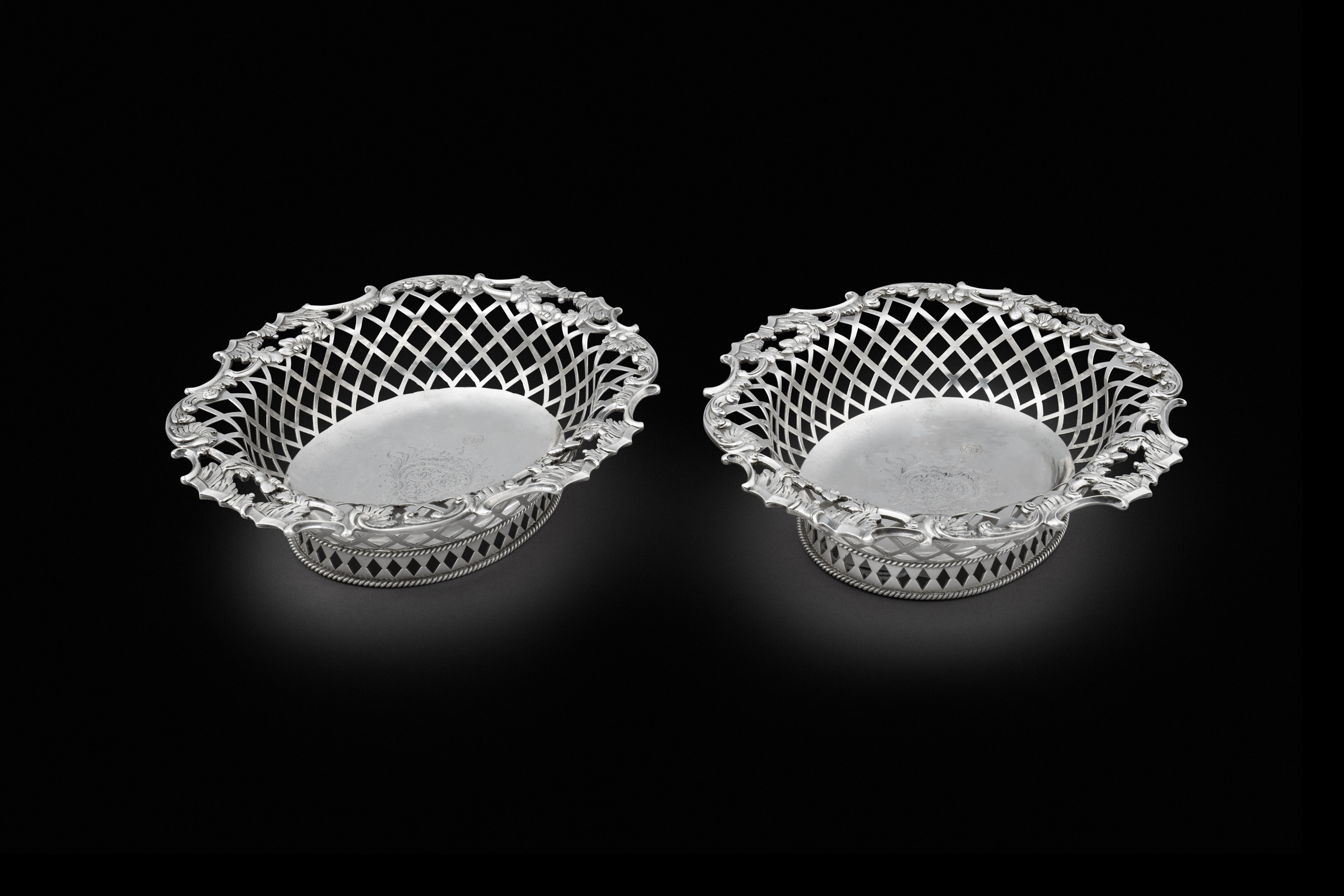 Each basket of shaped oval form, with C-scroll and acanthus leaf border, with pierced sides. The centre with engraved armorial for the Edward Hase and his wife Virtue Repps and an art deco monogram. The baskets resting on rope twist and pierced collet feet.