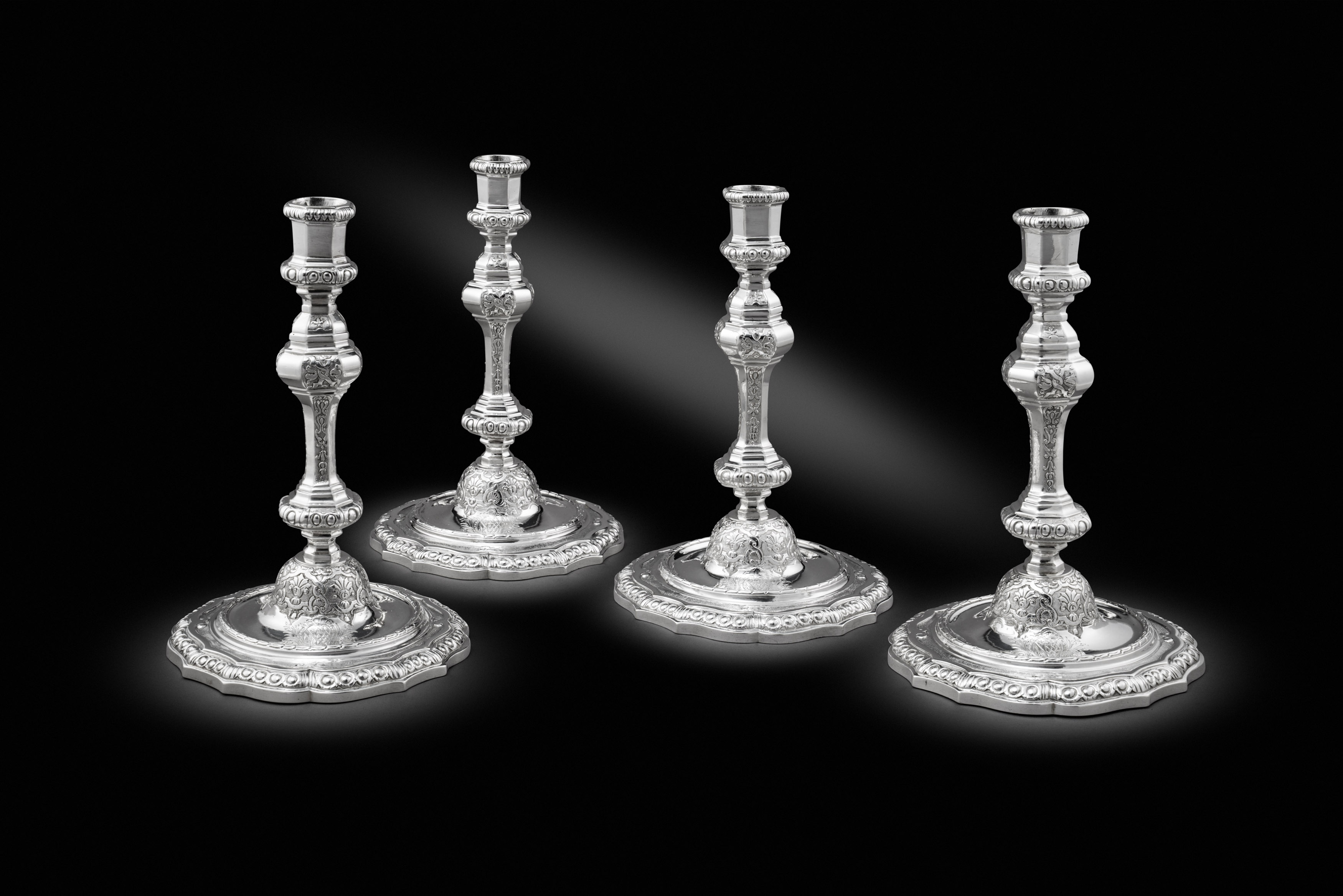 The candlesticks with round shaped pedestal bases are with a pearl border. The wells surrounded by a band of laurel leaves rising to a chased arch of shells. The octagonal columns with chased geometric designs.
