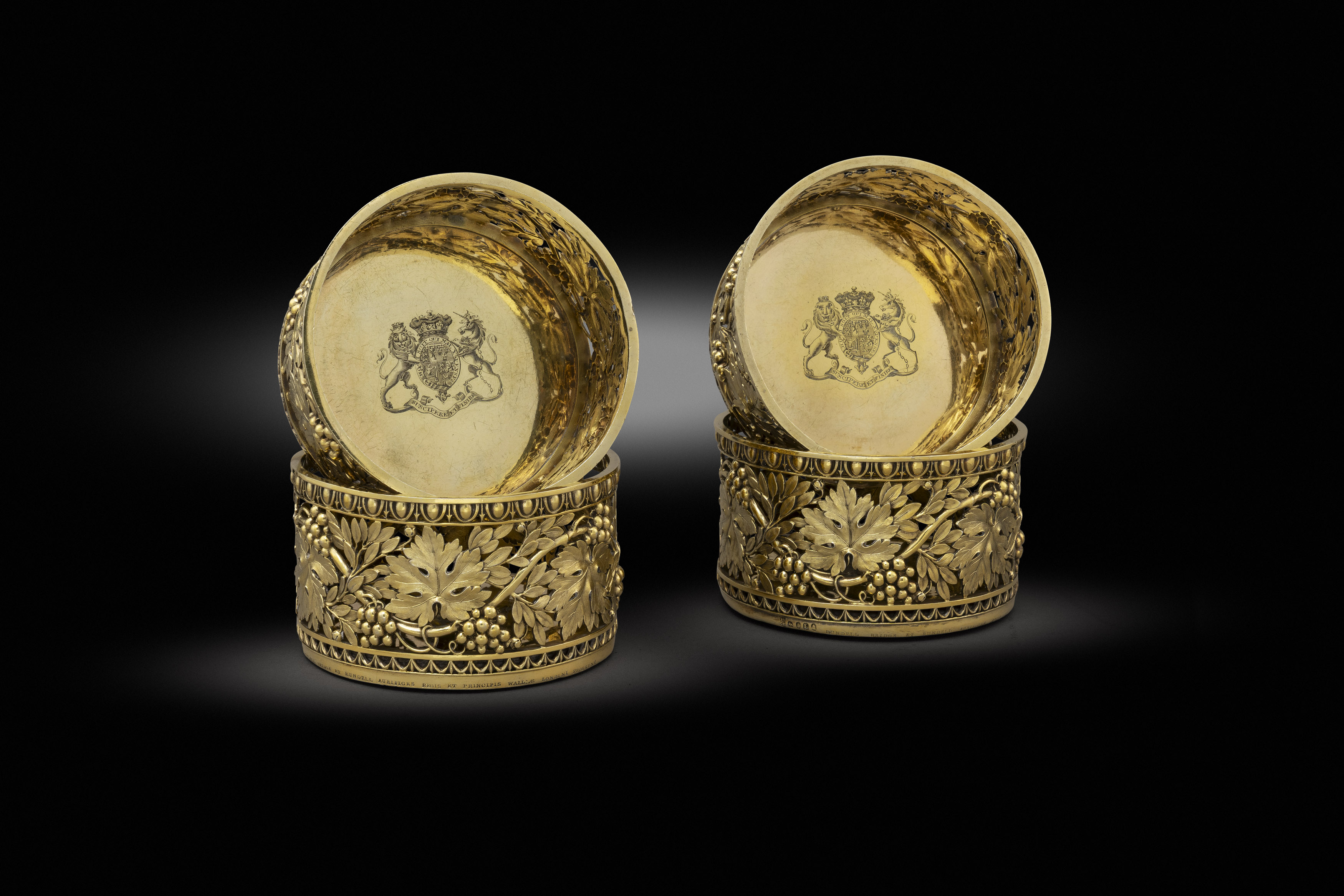 the sides pierced and chased with fruiting vines, the silver base plates engraved with royal ducal armorials, stamped for Rundell, Bridge & Rundell, and further engraved EAFs on the rims.