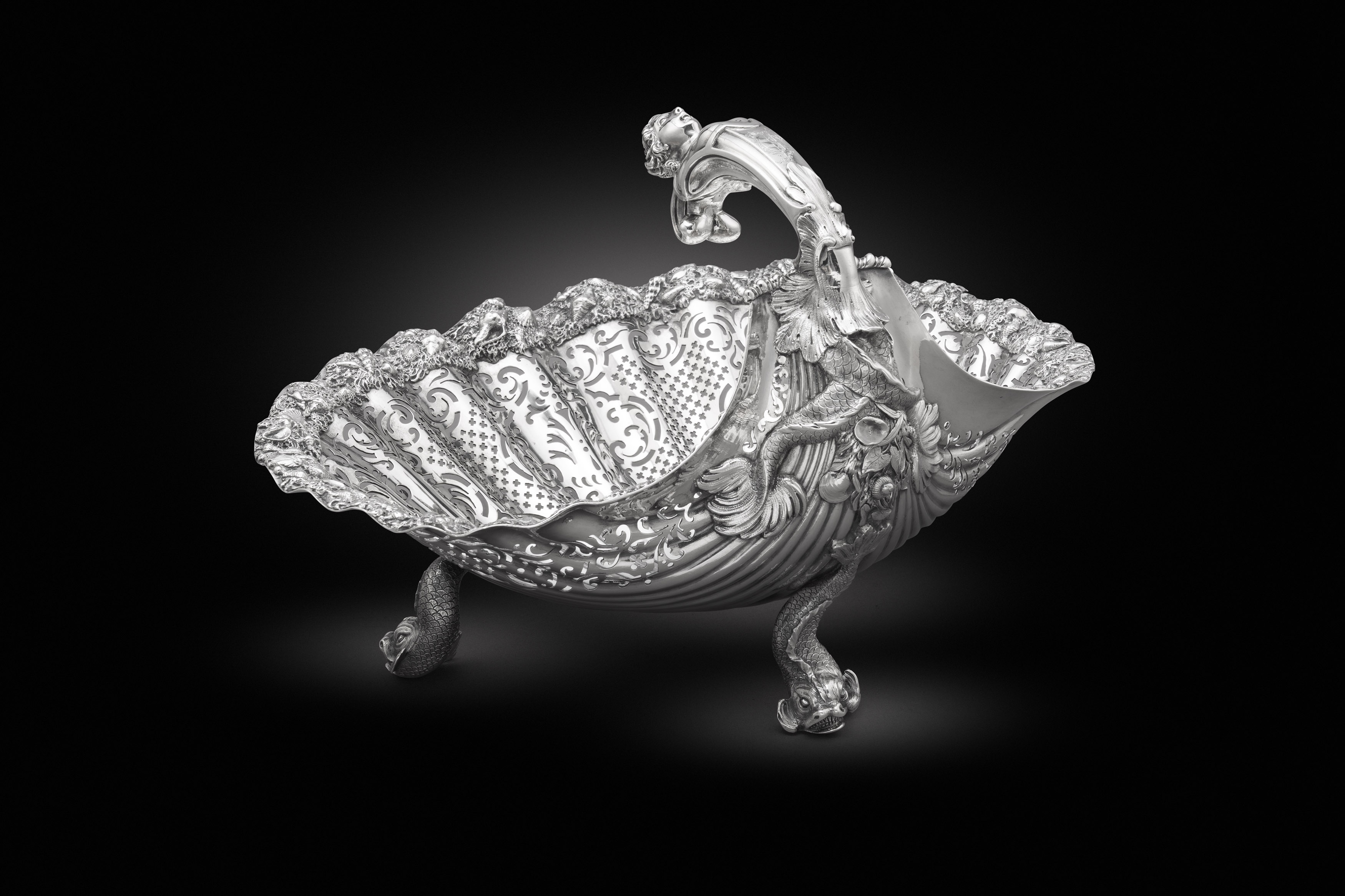 The shell of fluted form, on three cast dolphin feet, with rising caryatid handle, the border applied with shellwork and sand motifs, with a wide border pierced with trellis and scrolls, marked on reverse of shell, maker's mark obscured.